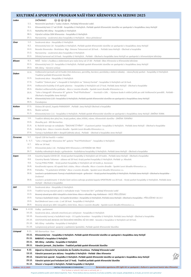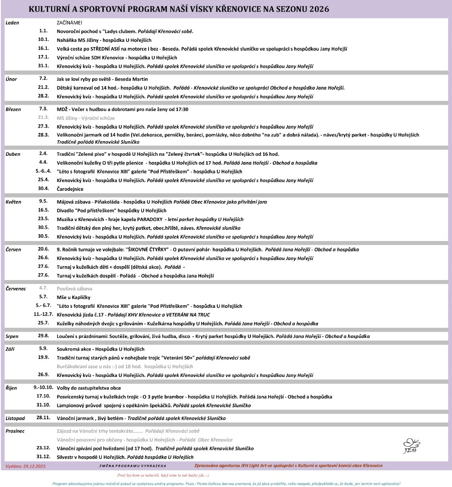 Aktualizovaný program kulturních a sportovních akcí v Křenovicích 12/2025