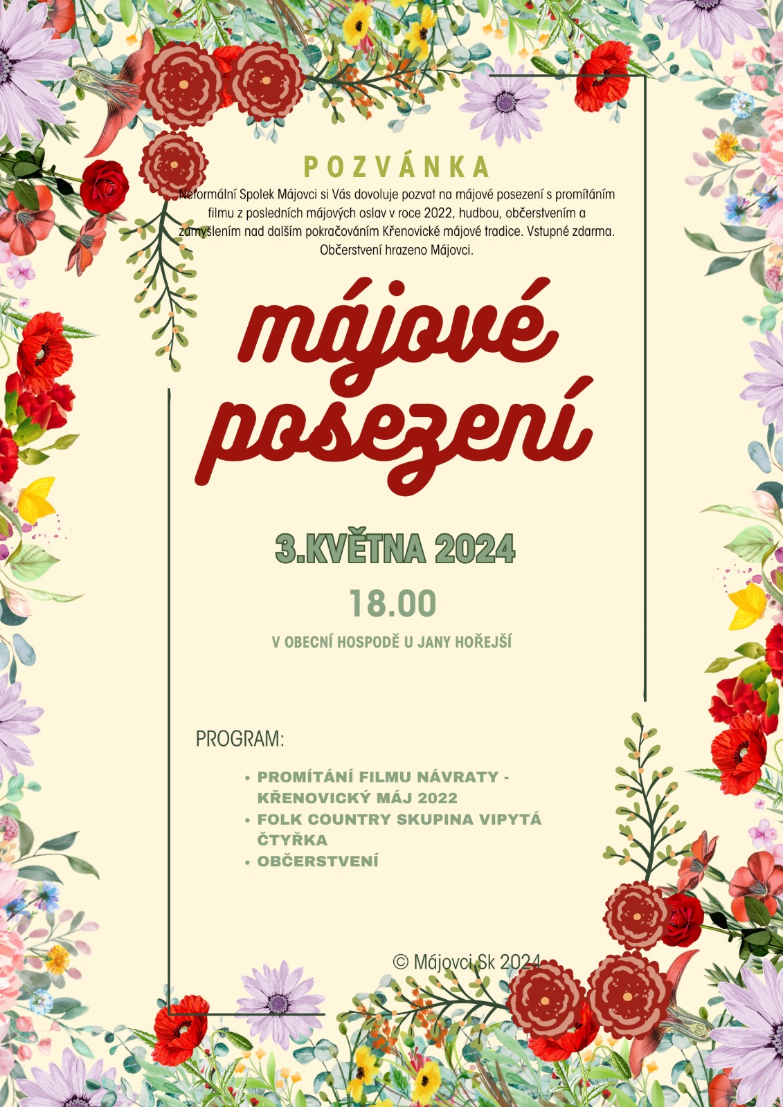 Spolek Májovci vás zvou na májové posezení 3. května 2024 od 18 hodin.
