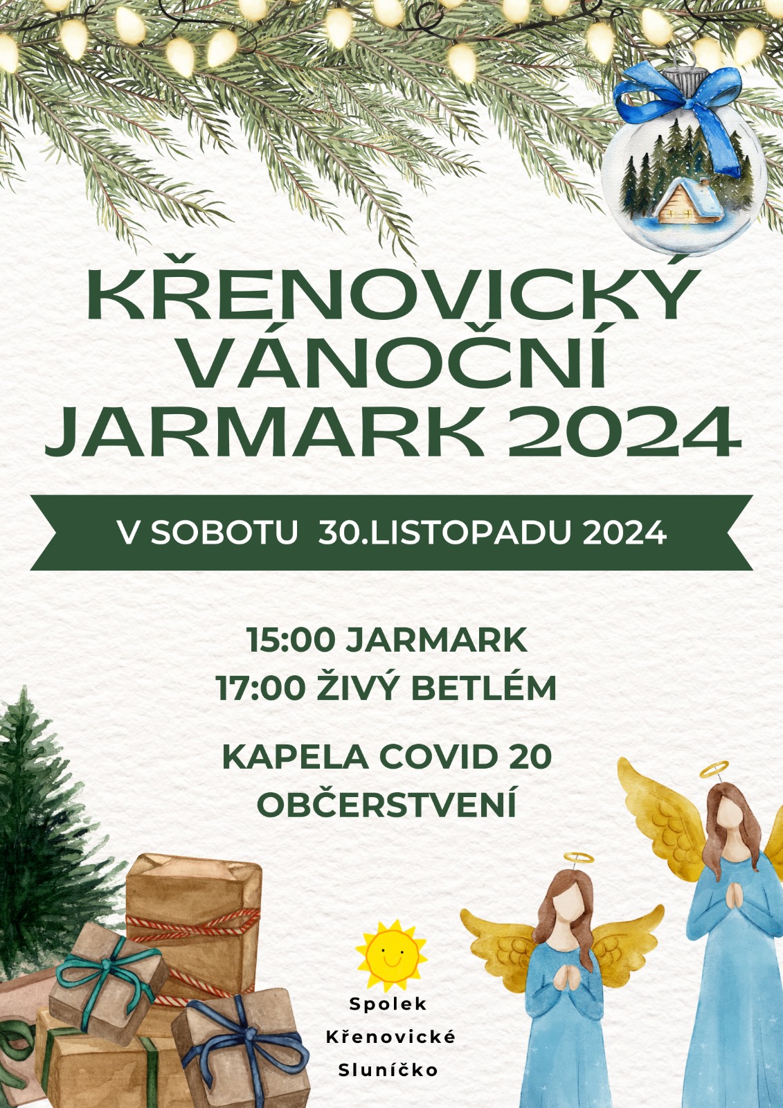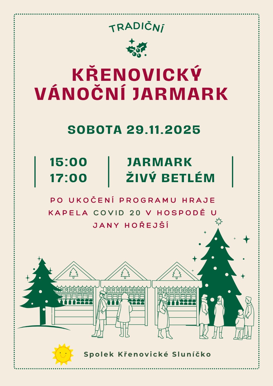 Spolek Křenovické sluníčko zve na tradiční Vánoční jarmark, který se uskuteční v sobotu 29.11.2025 od 15 hodin.