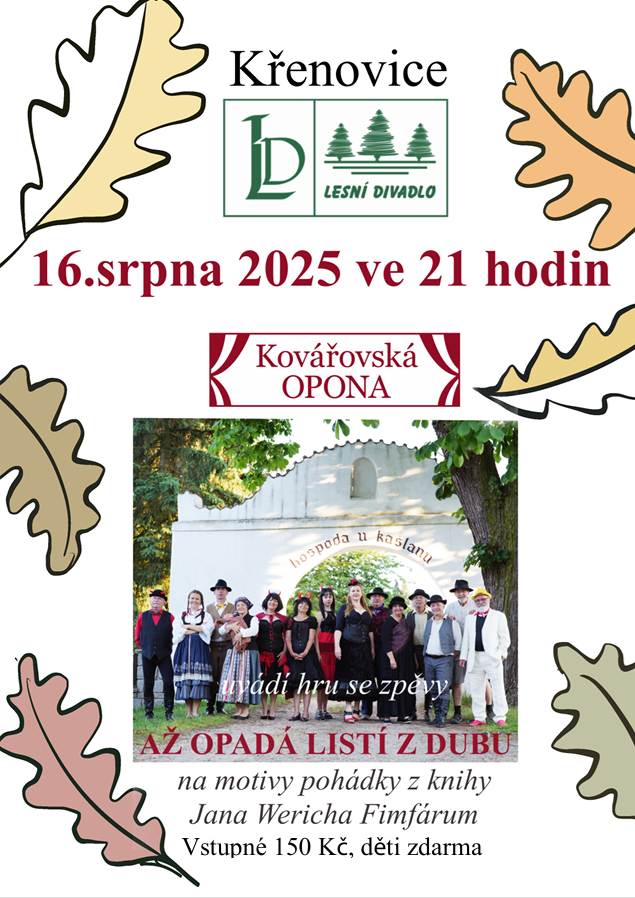 Jste všichni zváni na divadelní představení ochotnického souboru Kovářovská opona. Dne 16.8. 2025 zahrají hru "Až opadá listí z dubu". Prostor divadla otevřen od 20.00., začátek představení od 21.00. Občerstvení zajištěno. Více viz pozvánka.