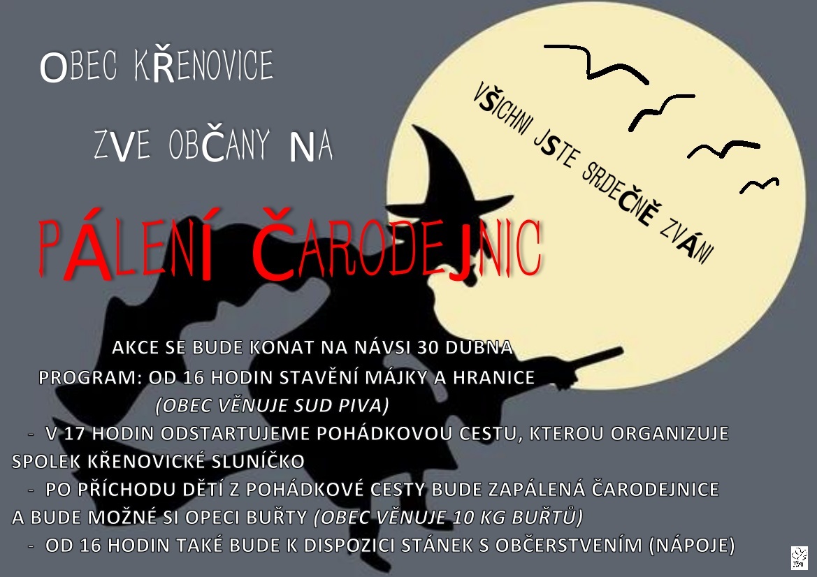 Obec Křenovice zve občany na tradiční pálení čarodějnic 30. dubna od 16:00 hodin na návsi.