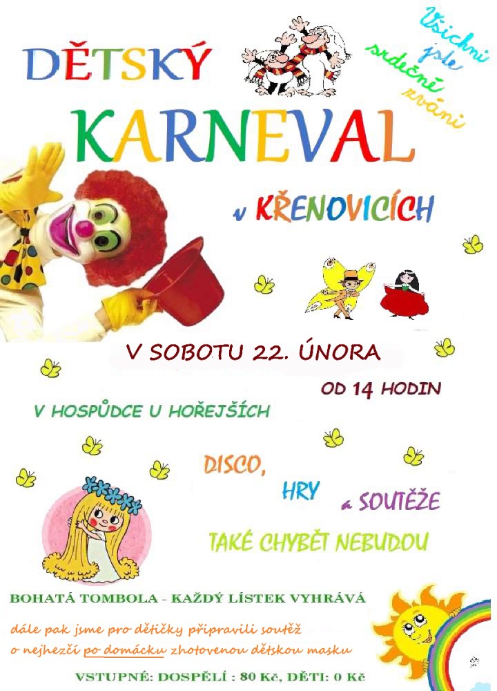 Všichni jsou srdečně zváni na dětský karneval v sobotu 24.2.2024
