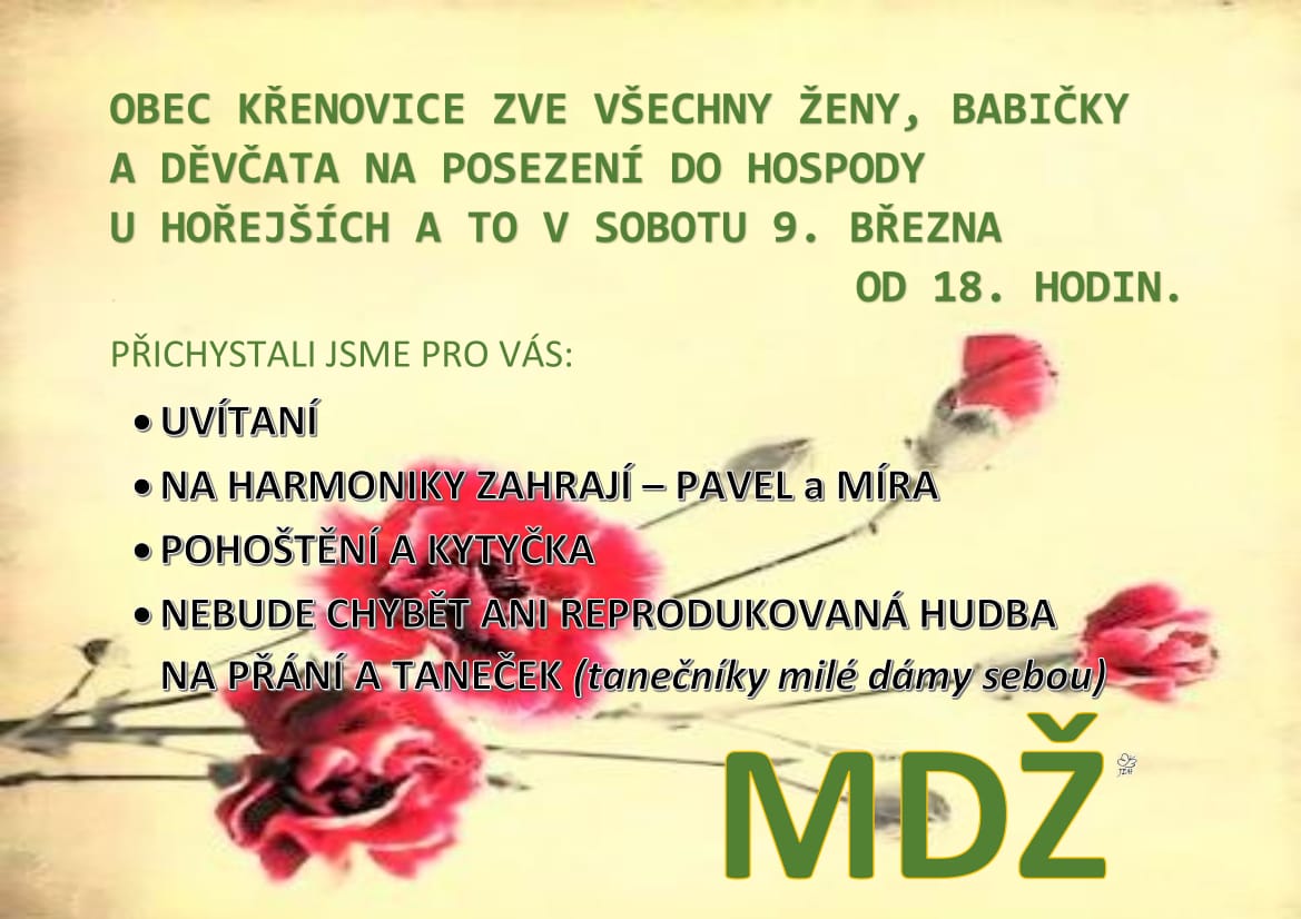 Obec Křenovice zve na MDŽ 9. března od 18 hodin.