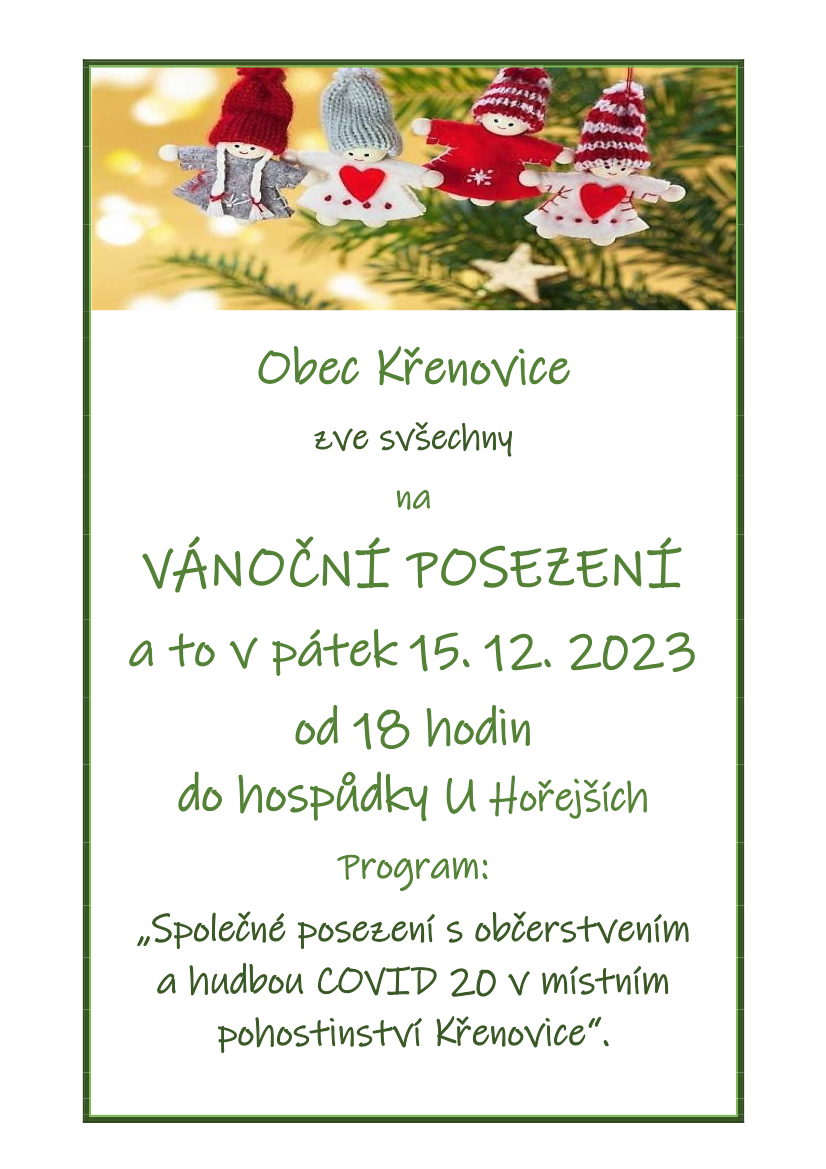 Obec Křenovice zve všechny na Vánoční posezení s hudbou v pátek 15.12.2023 od 18 hod.