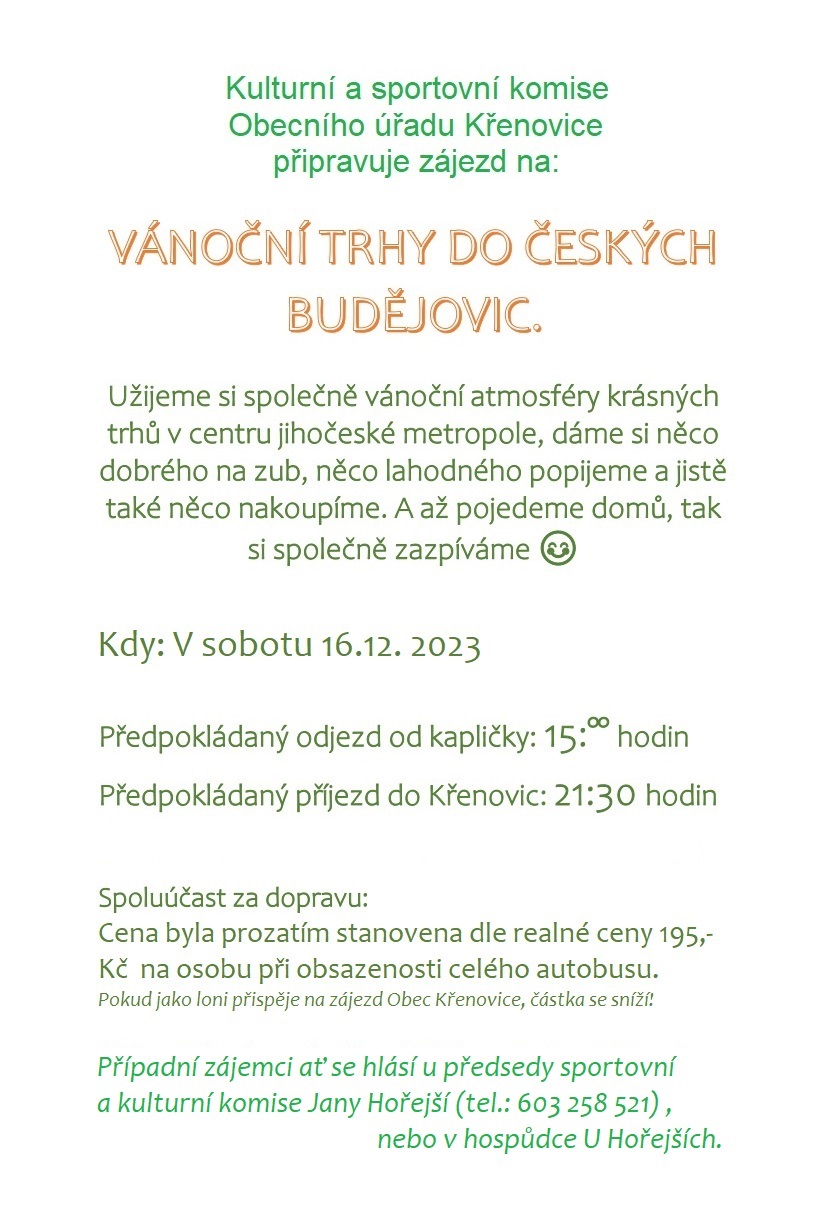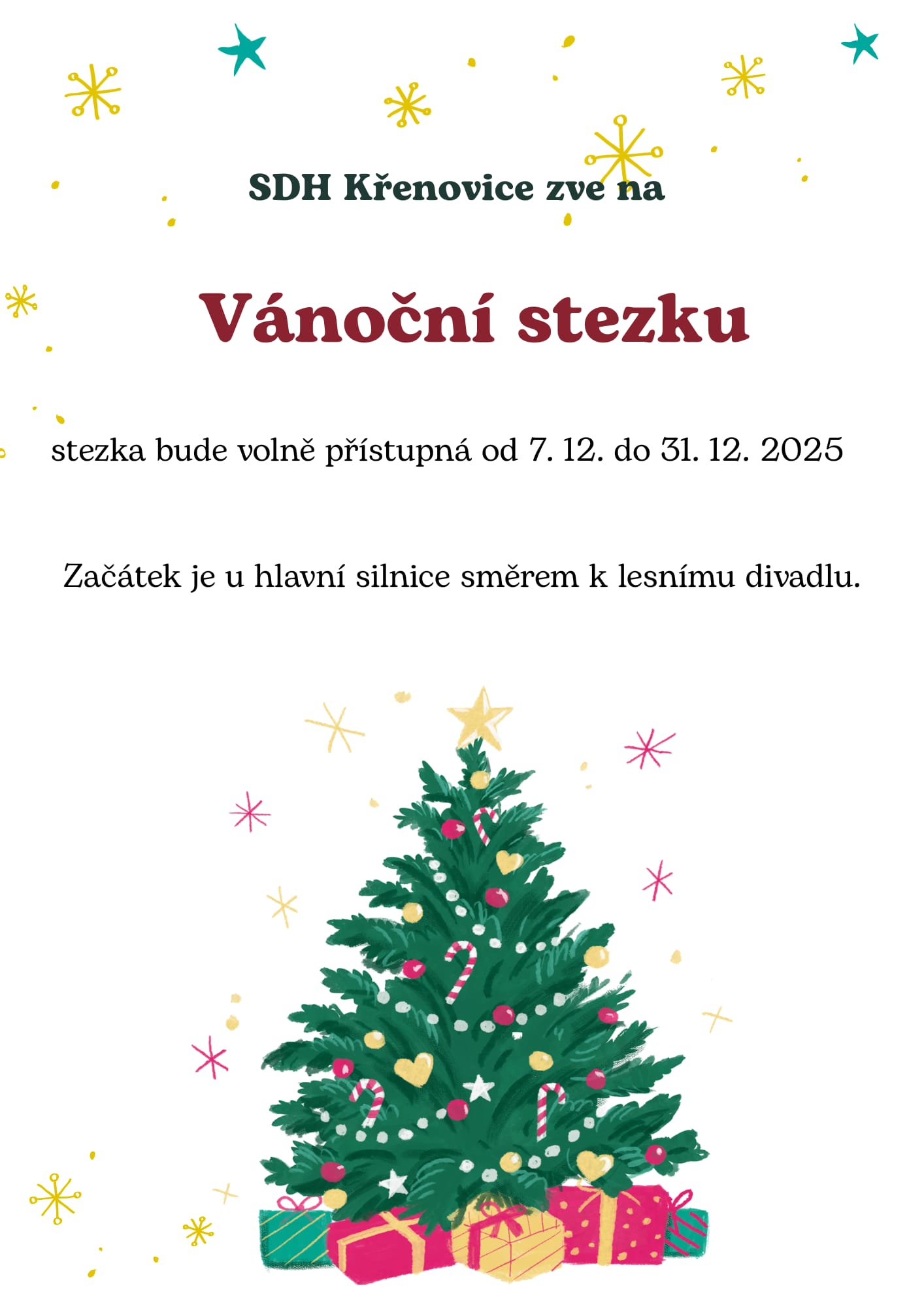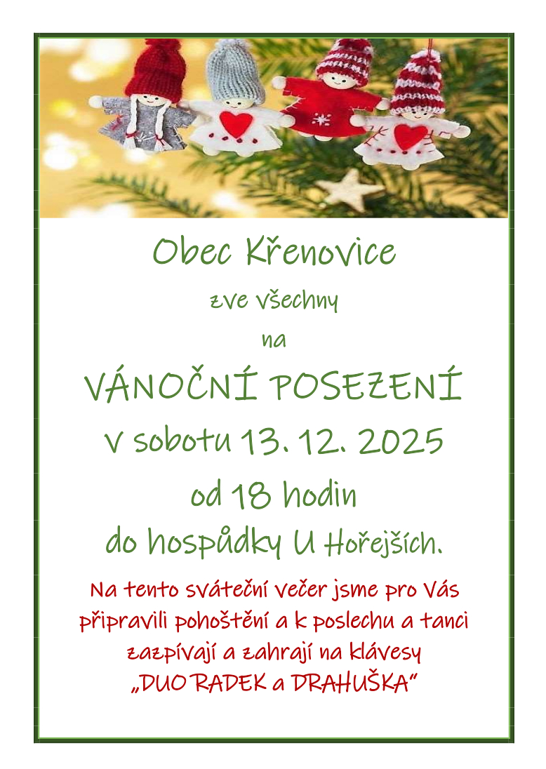 Obec Křenovice zve všechny na Vánoční posezení v sobotu 13.12.2025 od 18 hodin v hospodě u Hořejších