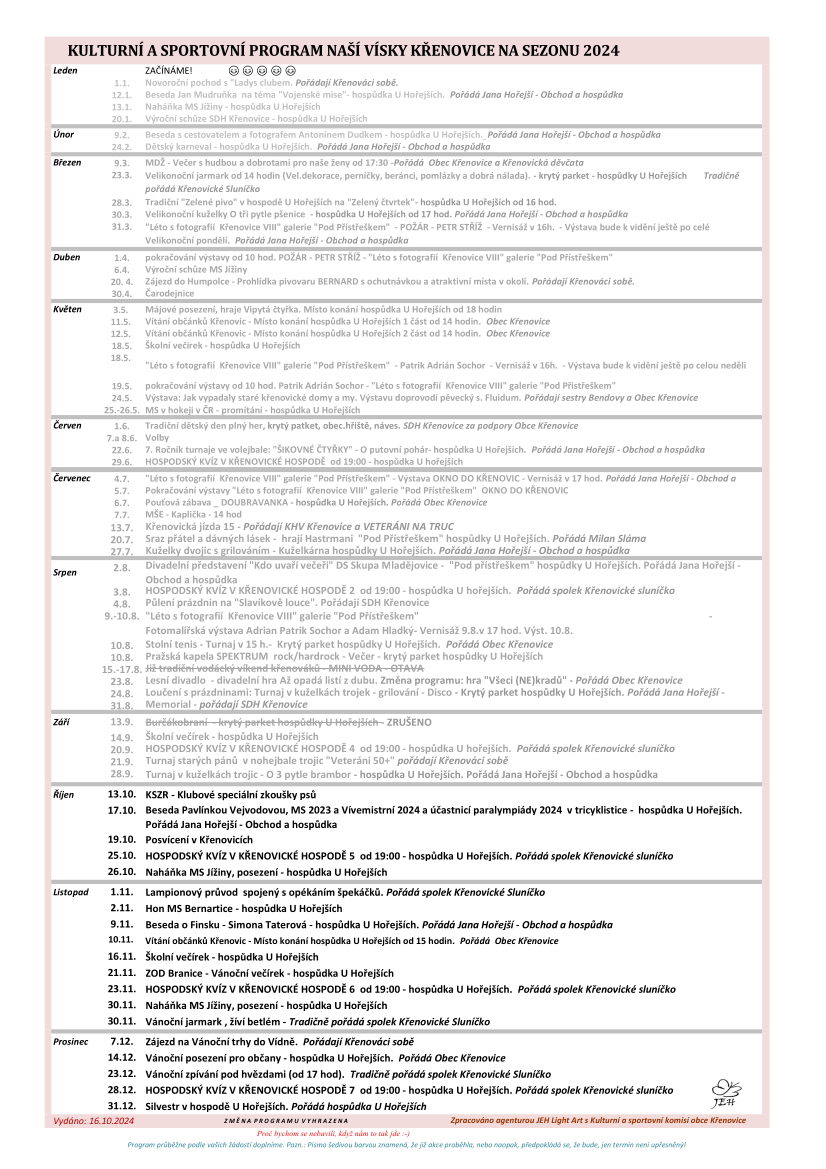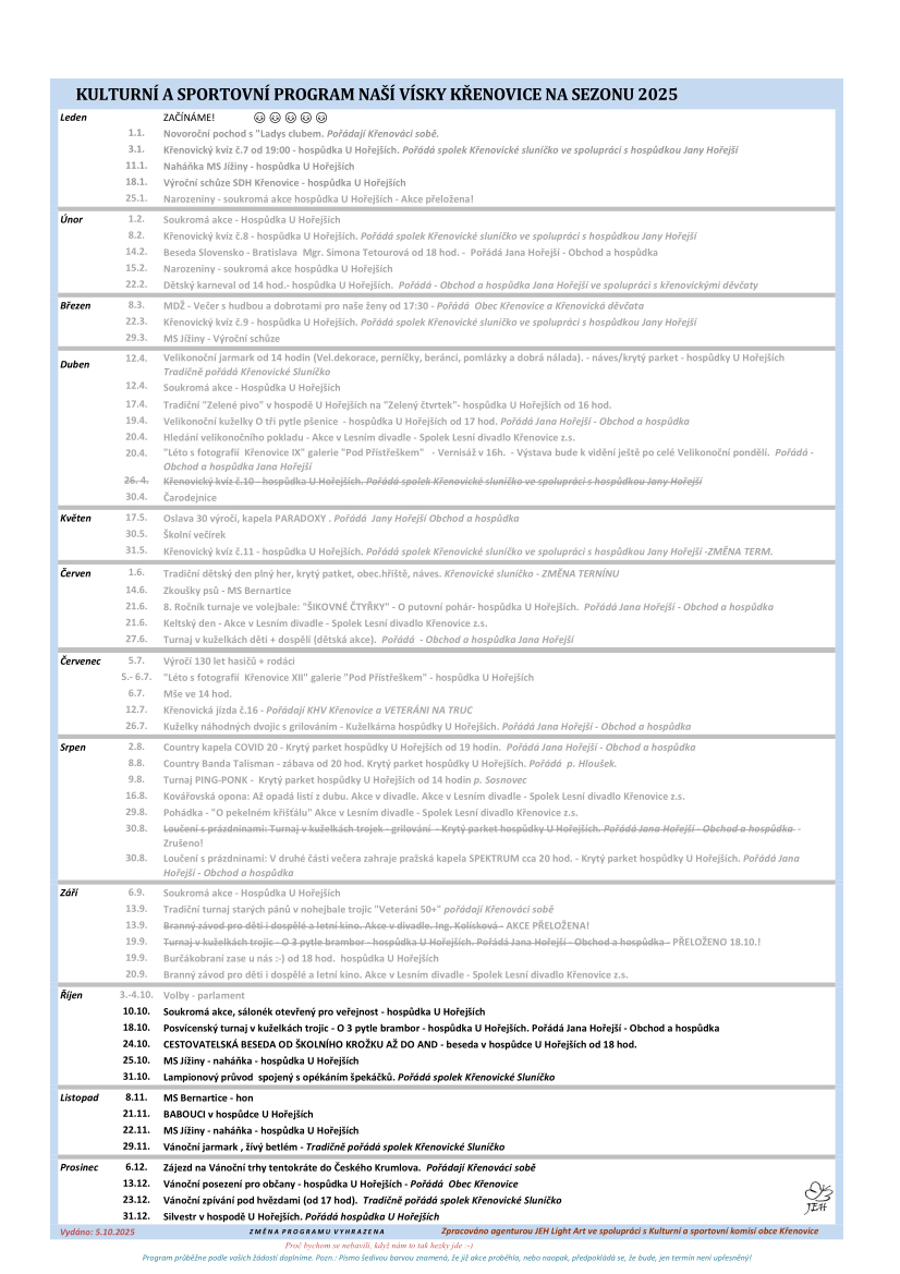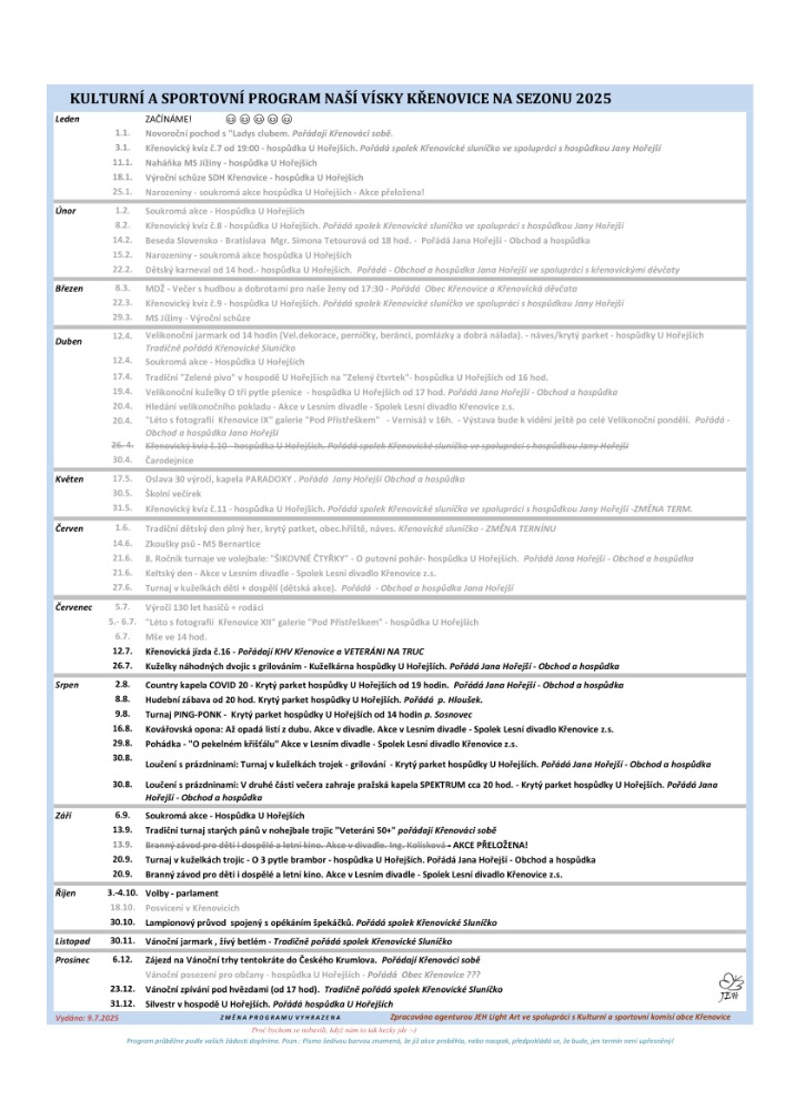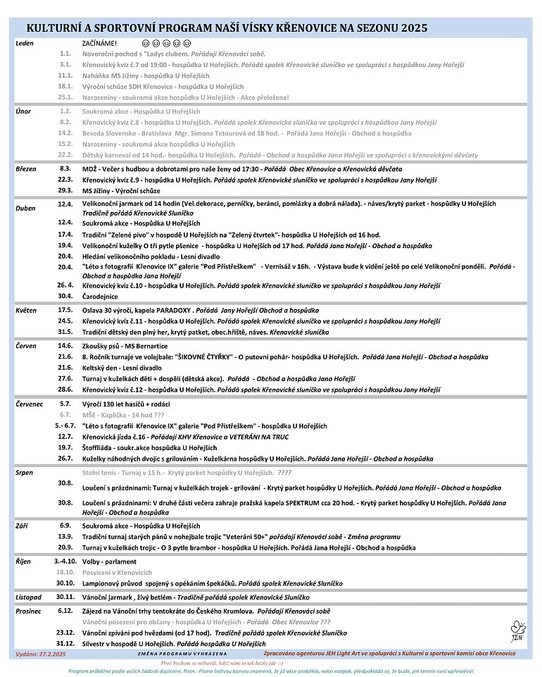 Aktualizovaný program kulturních a sportovních akcí Křenovice 02/2025